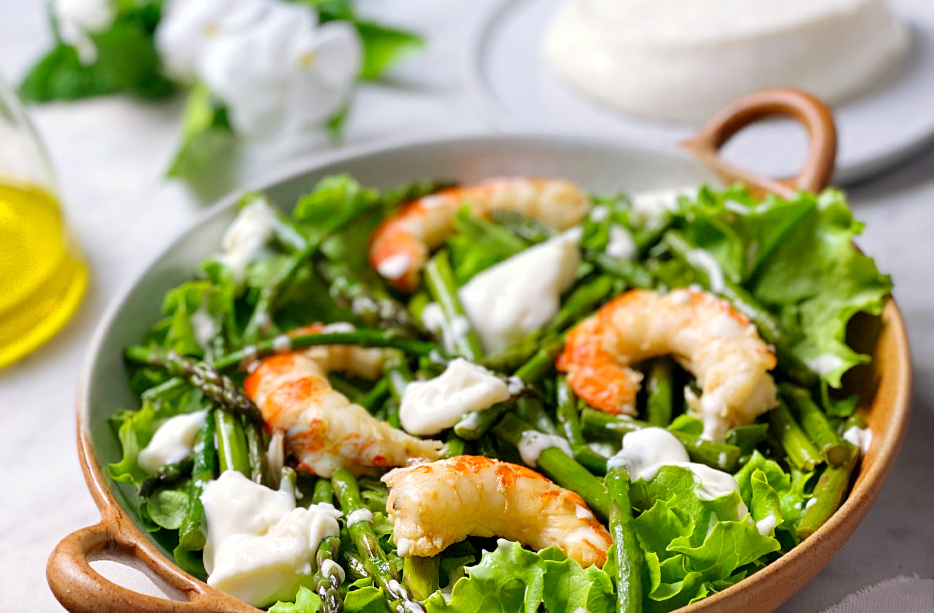 Il mare sposa la campagna grazie alla ricetta che ci propone Un pizzico di viola: un’insalata fresca e veloce, ottima da portare in tavola durante l’estate. Asparagi e gamberi preparati in padella, un letto di foglie di lattuga croccanti, salsa tahina e qualche ciuffo di Squacquerone di Romagna DOP Comellini per un’insalata estiva davvero speciale.