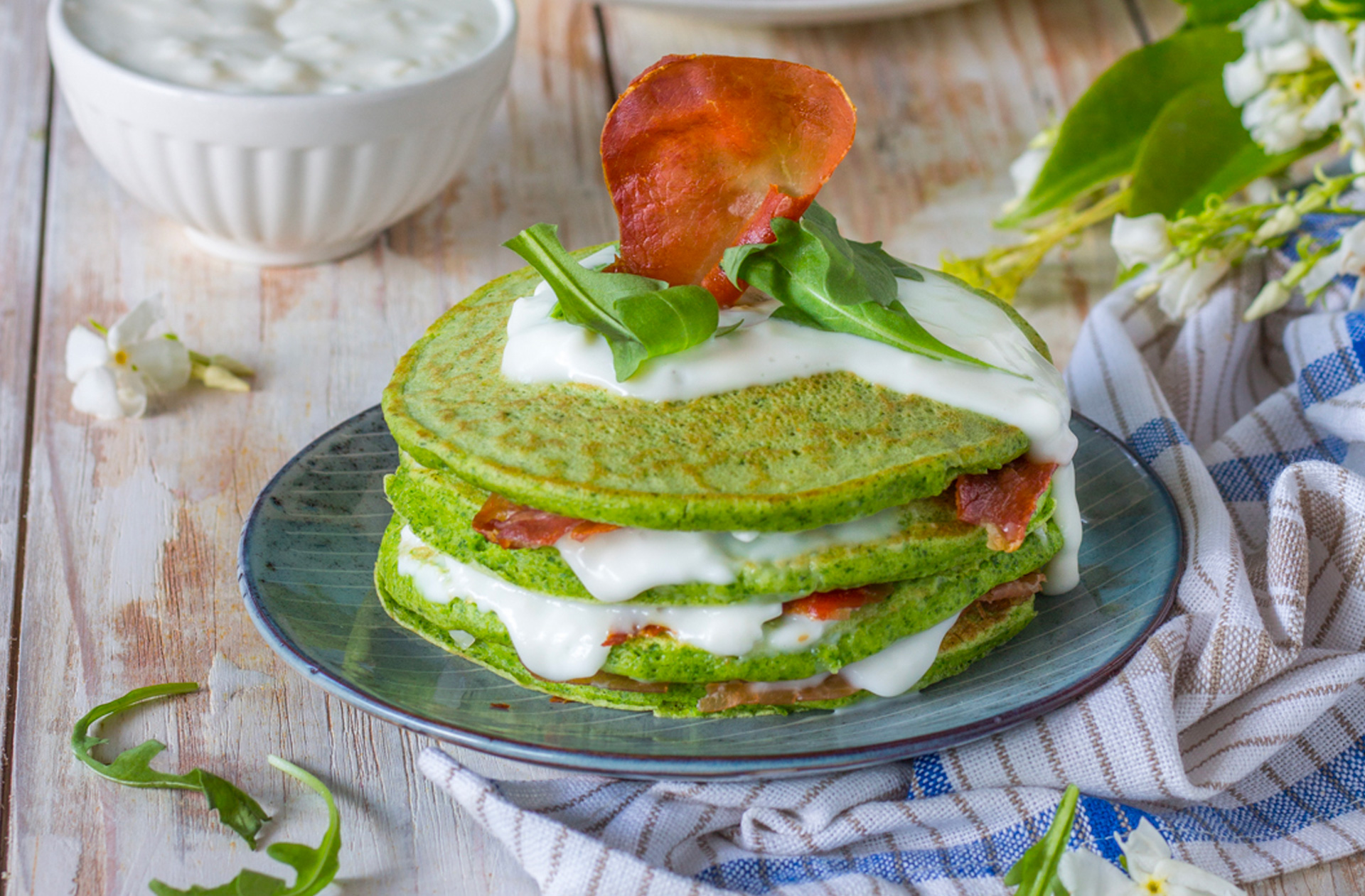 Pancake con rucola e prosciutto croccante